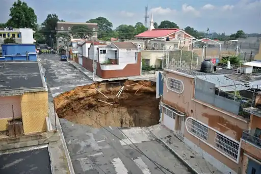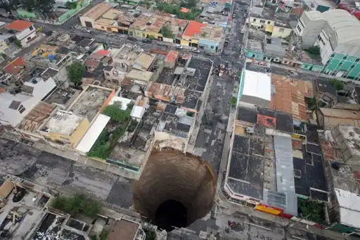 Загадочное явление произошло в столице Гватемалы вечером 29 мая. Помимо ущерба, нанесенного тропическим штормом «Агата», Гватемала-сити пострадала от необъяснимого провала в центре столицы – в практически идеально круглую дыру в земле ушло трехэтажное здание швейной фабрики и небольшой жилой дом.По разным источникам диаметр провала составляет около 20-30 метров, глубина по приблизительным подсчетам – 30-60 метров, во всяком случае, дна не видно даже с вертолета. По словам очевидцев, погиб один человек, однако местные власти пока не подтверждают эту информацию.