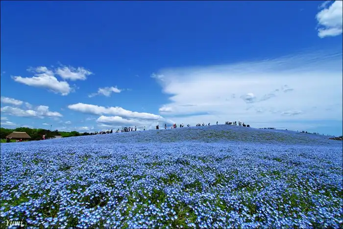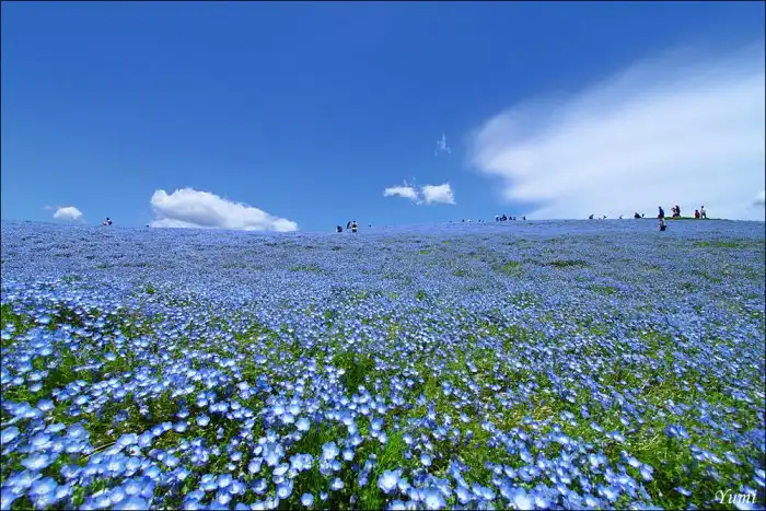 Японский национальный приморский парк Хитачи (Hitachi Seaside Park) расположен в префектуре Ибараки на о.Хонсю. Не так давно на месте парка были американские военные базы, земли которых в 1973 г. были переданы правительству Японии. В 1991 году небольшая часть парка (около 70 га) был открыта. В настоящее время парк расширился до 120 га и планирует расшириться до 350 га. В парке посажены целые поля различных цветов специально для проведения цветочных фестивалей: цветение уме и сакуры, тюльпанов, нарциссов, маков, лилий и конечно же немофилы (американской незабудки).