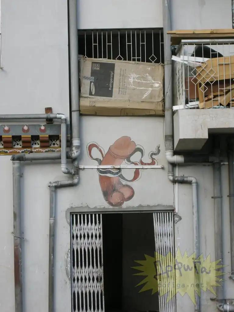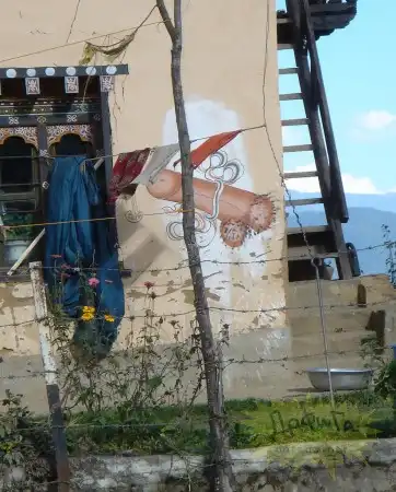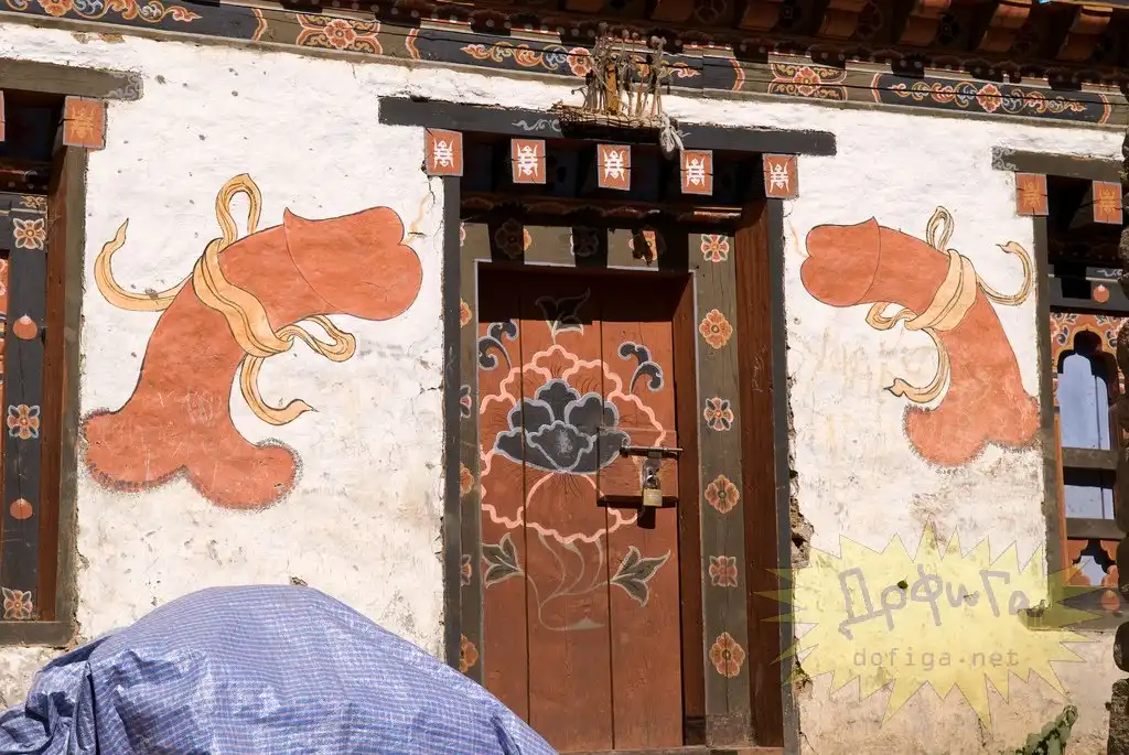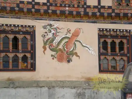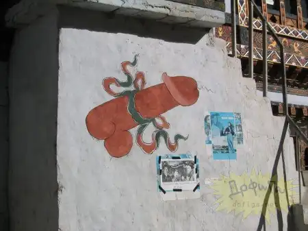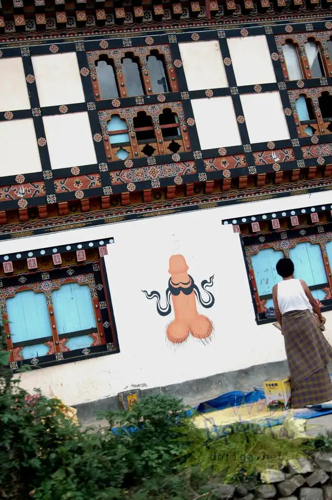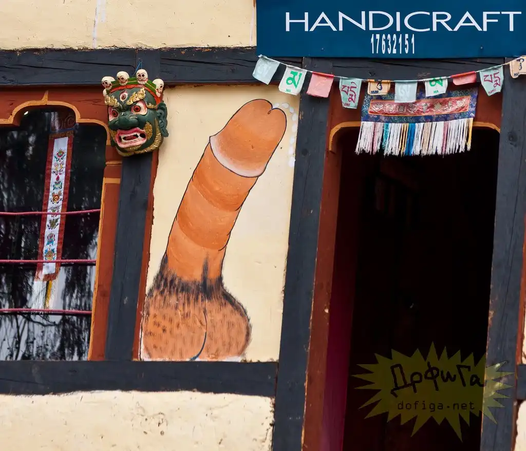 Бутан - глубоко религиозная страна , с огромным количеством легенд и поверий. Так вот бутанцы считают, что на их дома, магазины, храмы может напасть ведьма и чтобы её отпугнуть они рисуют пенисы на зданиях. Согласно поверью , пенис залезет в рот злой ведьме и она станет добрая :-))))))))) Для этих целей жители ещё и статуэтки пенисов дома держат , ну так , на всякий случай , если увидят колдунью сами , чтобы засунуть ей в рот этот фаллос и обезоружить несчастную :-))))))))))