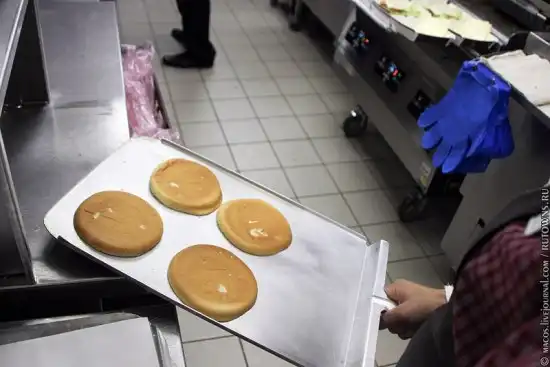 Вообще, кухня разделена на две зоны - зона "всегда готов" и "сандвич для вас". В первой зоне готовят самые популярные блюда - они всегда пользуются спросом, и ребята здесь работают, как на конвейере. Вторая зона - это если вы заказали филе-о-фиш, например, или куриный сандвич. Они не так популярны, как гамбургер или биг мак, к тому же у них отличается технология приготовления.