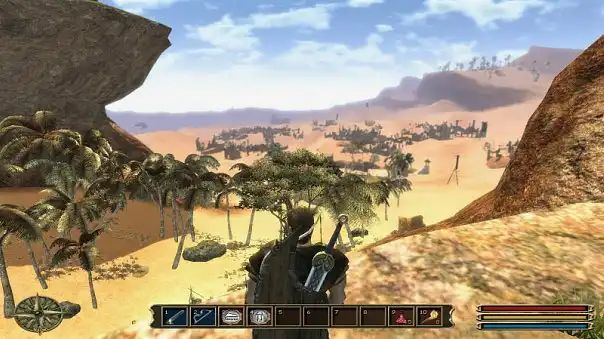 Из разговоров с местными жителями становится ясно, что теперь орки заправляют всем и еще один наш давний знакомый - темный маг Ксардас, сильно помог им. Где он находится теперь - непонятно, вот перед нами и встает первая глобальная проблема - найти его. Ну а дальше, по традиции вы вольны делать, что хотите, чтобы добиться этого. Перед вами лежит огромная территория (она превосходит Хоринес в разы), на ней вы встретите леса, наполненые разнообразными тварями и весьма недружелюбными бандитами, города, захваченные орками, пустыни и горы.