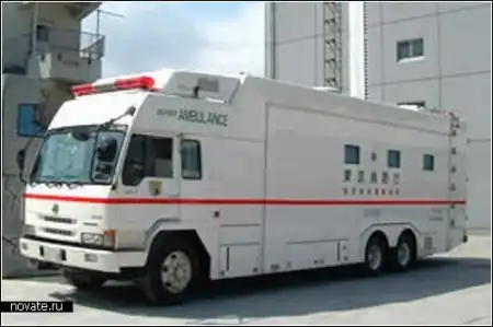 Такая карета скорой помощи колесит своими шестью колесами по дорогам Японии. Быть может, такая помощь не будет очень скорой, зато она будет оказана сразу большому количеству пострадавших, поскольку внутри есть помещения для нескольких больных. Если учесть, что Япония относится к сейсмически нестабильным государствам, помощь такого автомобиля будет очень уместной, если в больницу необходимо будет транспортировать жертв землетрясения или наводнения.