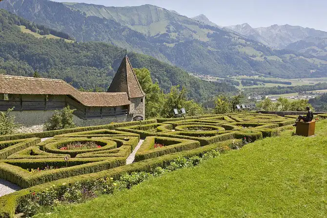Внутренний парк цитадели похож на атриум в Монт-Сент-Мишеле во Франции. Обратите внимание на скульптуру, которая задумчиво сидит напротив лабиринта.
