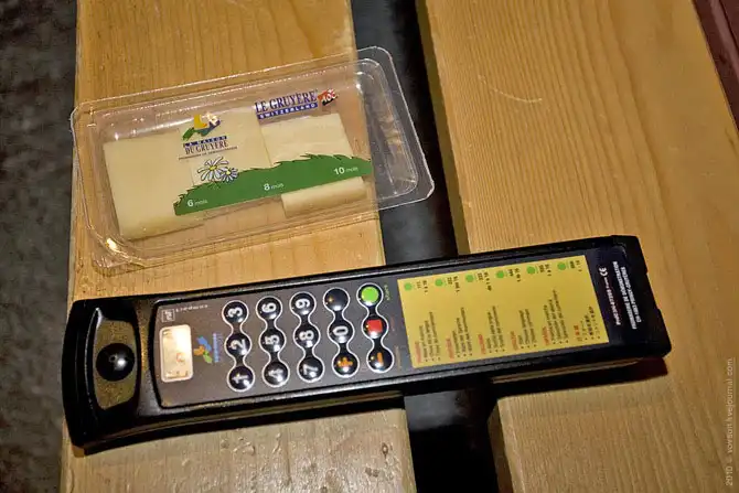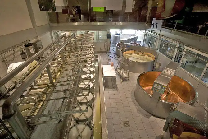 В самом заводе есть экскурсии. Конечно, в сам зал не пускают, вернее, пускают, если заранее согласовать и решить все медицинские вопросы, но времени у меня на это не было. Обычных посетителей пускают на балкон, который отделён стеклопакетом, а-ля шоу «За стеклом». Вместе с персональным аудио гидом выдают сэмплинг — три кусочка Груэра выдержкой 6, 8 и 10 месяцев. Мне больше всего понравился 8-месячный. Ещё есть сэмплинг в магазине, о нём чуть ниже.
