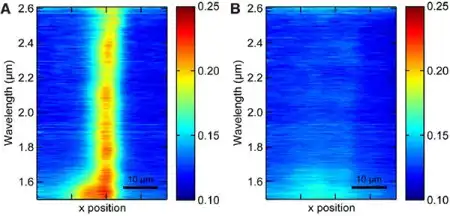 Рис. 2. Пространственное распределение интенсивности отраженного от золотой пластины инфракрасного света (длина волны показана по оси ординат слева), когда она не укрыта (A) плащом-невидимкой и когда укрыта (B). Наличие выступа на пластине (при отсутствии плаща) приводит к неоднородному рассеянию падающего излучения, что порождает неравномерное распределение отраженного инфракрасного света (шкала распределения интенсивности показана на оси ординат справа). В итоге на рис. A явно просматривается выпуклость. Во втором случае, когда золотая пластина укрыта плащом, наблюдается равномерное распределение отраженного инфракрасного света. Это означает, что излучение не видит выступа на пластине. Рисунок из обсуждаемой статьи в Science