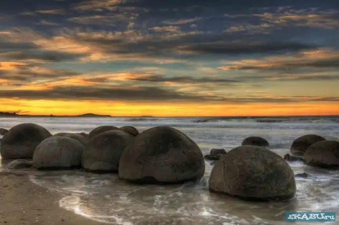 Ново-Зеландские камни Моераки тоже очень похожи на творение рук человека. В действительности процесс образования этих камней был идентичен процессу роста жемчужины внутри раковины. В палеоцене обломок скалы или дерева стал обрастать известняком и покрываться осадочными породами. Затем прибрежная эрозия освободила эти камни от осадочных пород и представила их на обозрение разумным обитателям Земли.