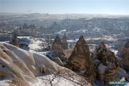 Опять Каппадокия (Турция). Эрозия тонны мягких вулканических пород, оставив более прочные. Эти "волшебные дымоходы", испещрённые пещерами представляют весьма необычное зрелище