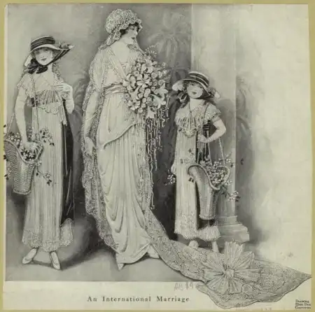 При проведении свадьбы строго соблюдали традиции. Многие из них используются и в наши дни. По пути следования свадебного поезда разбрасывались цветы. В свадебный поезд помимо жениха и невесты входили их родители, подружки невесты, сестры жениха, его дружки, а также родственники и друзья невесты и жениха. Подружки невесты (обычно человек шесть) одевались в платья, фасон и цвет которых выбирала невеста, а ее мать оплачивала их стоимость.