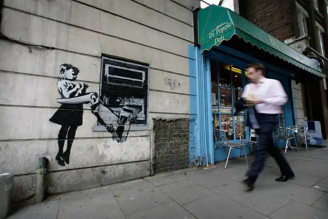 Граффити, изображающие банкомат, похищающего ребенка, украшают одну из стен улицы Эксмут-маркет. Раньше об этом местечке ходила дурная слава. Но с середины 90-ых оно изменилось и теперь улица Эксмут-маркет в основном известна своими ресторанчиками, кафе, барами и магазинами.