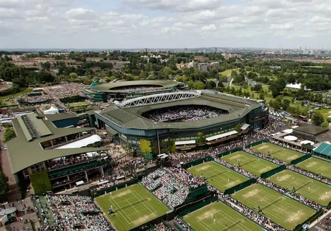 Вид стадиона Уимблдон и всех теннисных кортов в Крокет Клубе.