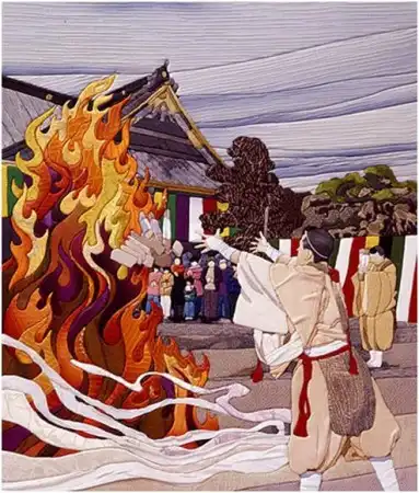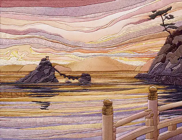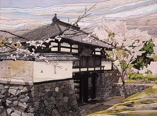 Эскиз кинусайга сначала рисуется на бумаге, затем копируется на дерево. В дереве по контуру линий прорезаются углубления, и в них заправляются края шелковых лоскутков. Точный подбор оттенков делает картинки очень живыми. А четкий контур заправленных лоскутков – похожими на фотографии.