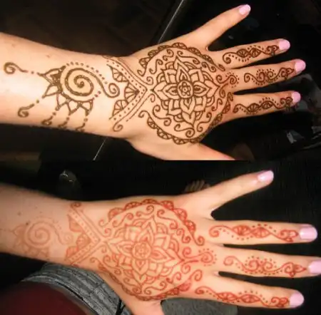 Не пугайтесь, что рисунок сразу после нанесения ярко-оранжевый. Через 24-48 часов узор станет обычного темно-коричного цвета. До этого времени нужно избегать контакта узора с водой. Долговечным рисунок сделает протирание маслом в течение 2-3 дней после нанесения. Место, где нанесён узор, лучше не тереть и не намыливать, а лишь легко ополаскивать водой. Роспись хной исчезает медленно, в течение 2-3 недель постепенно обесцвечиваясь.
