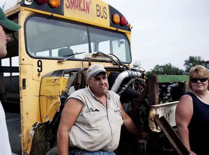 Гонщики скупают старые автобусы и убирают окна и пассажирские сиденья. Они усиливают защиту двигателя стальными рамами. Некоторые усиливают двигатель, другие раскрашивают автобусы. На фото: Кевин Поппелл позирует между автобусами своего друга Эда Уоркмана – на одном он ездил в прошлом году, на другом – в этом.