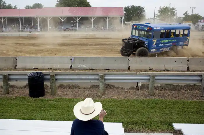 На американских ярмарках активно рекламируют гонки на школьных автобусах.