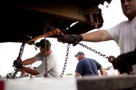 Владелец одного из автобусов Лью Кантер купил свой автобус за 1000 долларов. Они с друзьями немного поработали над двигателем, так что он выпускал черный дым из выхлопной трубы. На фото: Геофф Трэйнер (слева) и Энтони Шаффер помещают автобус на прицеп после гонки.