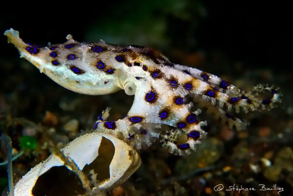 Синий кольцевидный Осьминог является маленьким, размером с мяч для гольфа, но чрезвычайно ядовитым существом, обитающим в прибрежных водах вокруг Австралии и немного севернее, в сторону Японии. Сине-кольцевидный осьминог обычно светлый по цвету, с темно-коричневыми группами по его восьми ногам и телу, с синими кругами, добавленными по верх этих темно-коричневых групп. Когда осьминог потревожен или вынут из воды, он темнеет, и кольца становятся блестящими и принимают цвет электрик, и именно это цветное изменение дает животному его название.