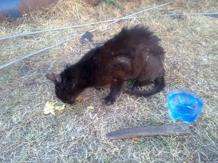 Это несчастное существо хрипело в зарослях, когда мы подошли. Пришлось как-то реабилитировать. Сначала дали воды и размоченных чипсов. Потом увезли его в соседнюю деревню, где живут люди, купили молока, кошачей еды и пристроили в деревянный ящик с узким лазом (защита от собак). Существо наелось, напилось, пришло в себя и стало даже мурлыкать и вылизываться. Кошек там много, те кто еще в состоянии - подходят и начинают так ластиться, так проситься, чтобы их забрали... Подошла осторожно и собака - как сказал местный алкаш: "Они все погорельцы". Я разорвала сверху пачку молока - показываю, пей, мол, тут, рядом с котом, вам надо подружиться, а то еще загрызешь его, знаю я твою породу. Она не смогла. Взяла аккуратно пачку молока зубами за верх, отошла на пару шагов и стала лакать.