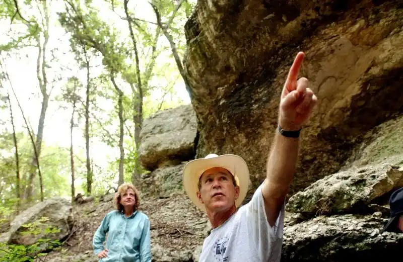 9. Президент Джорж Буш в Кроуфорде. Джорж Буш прогуливается по каньону вместе с советником президента Гарриет Майерс на его ранчо в Кроуфорде, Техас, 9 августа 2002 года. Президент провел каникулы (1 месяц) на своем ранчо.