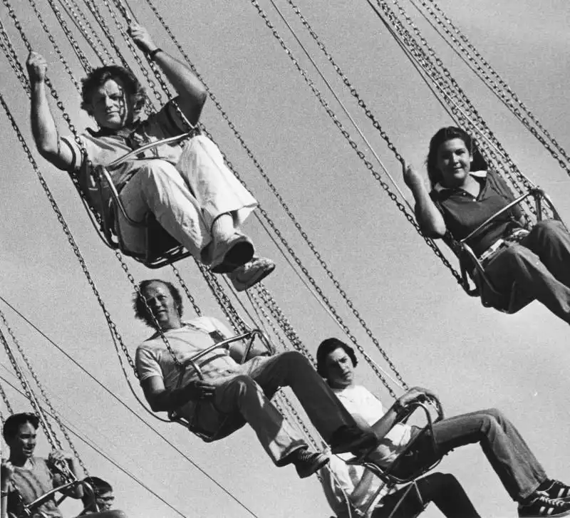 5. Сенатор Эдвард Кеннеди катается на американских горках вместе со своей семьей. Сенатор Эдвард Кеннеди катается на американских горках в Риверсайд Парке Агавам, штат Массачусетс, вместе со своим сыном Патриком (на переднем плане), племянником Крисом Кеннеди (в центре справа). Это начало его отдыха 7 августа 1979 года. Кеннеди в месте со своими сыновьями, дочерью, племянниками, племянницами и друзьями провел 2 дня в западной части штата. Две девушки позади Кеннеди на фото неопознаны. (UPI Photo/Alan Altman/Files)