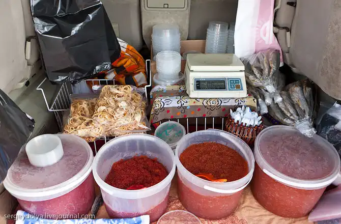 Визитная карточка Владивостока – красная икра. Прямо перед аэропортом всегда стоят несколько автомобилей, торгующих свежей красной икрой и прочими морскими вкусняшками: