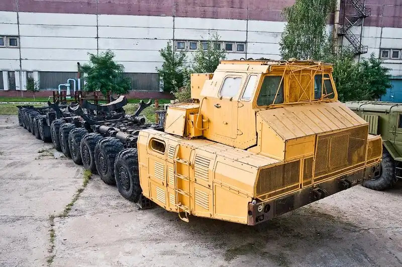А вот это настоящий тягач апокалипсиса. МАЗ-7907. Ракурс не самый удачный, не передает всей огромности, его загораживали другие машины. 30 метров длиной (высота девятиэтажки), все 24 четыре колеса ведущие. На него должна была монтироваться баллистическая ракета комплекса Целина-2. Пока шли испытания, холодная война закончилась, и единственное, что удалось этому монстру через десять лет после постройки - в 1995 году, перевезти 40-метровый и 100-тонный корабль из Борисова на озеро Нарочь.
