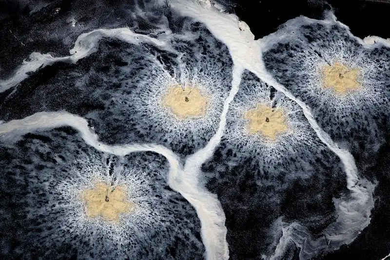 Залив Ботния, Швеция. Бассейны для переработанных продуктов у лесопилки недалеко от портового города Карлсборг похожи на следы от стрельбы по стеклу. (© Robert B. Haas)