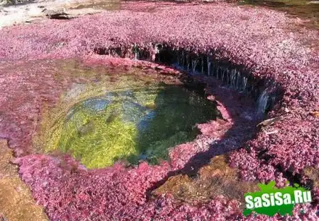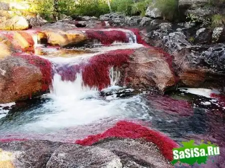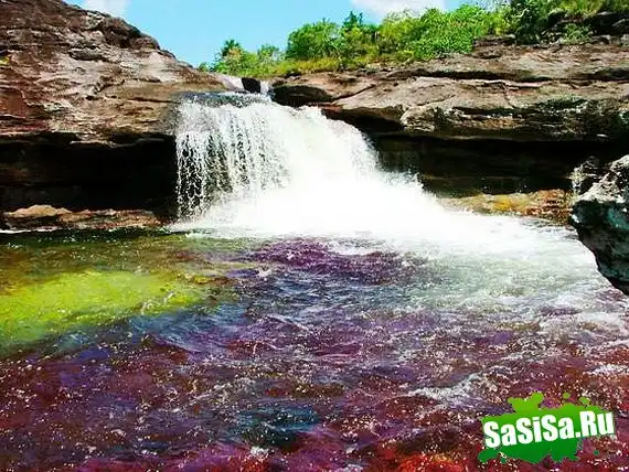 «Река пяти цветов» Каньо Кристалес берет начало на южной стороне горной цепи Макарена, Колумбия. Разноцветность воды обусловлена наличием большого количества различных водорослей. В зависимости от сезона продукты жизнедеятельности того или иного растения окрашивают воду в желтый, зеленый, красный, голубой и черный цвета