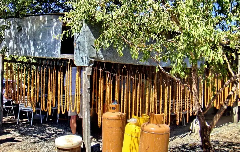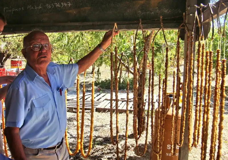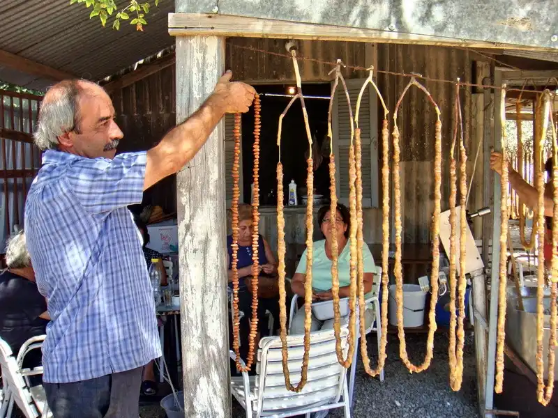 12. Вот Михалис демонстрирует три степени «зрелости» джукджука – от ореховых «бус» до полноценной «колбаски».