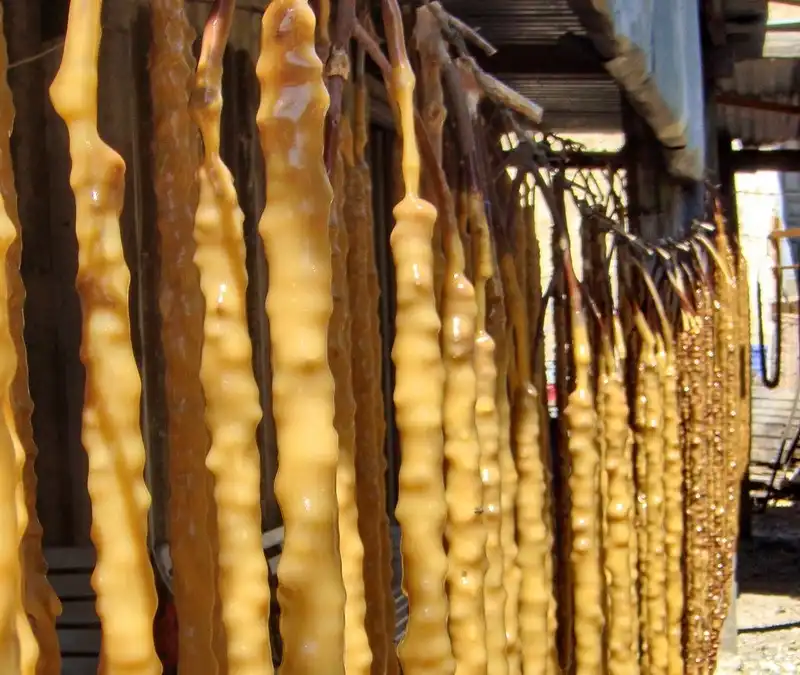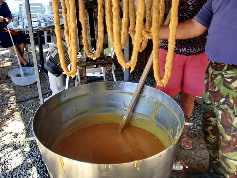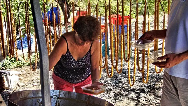21. Михалис сказал, что «чикены» и «порки» очень любят жмых – это для них лакомство. Когда все ниточки нужное количество раз окунули в палюзе, а самого палюзе осталось уже не много – его разливают в формочки. Оно скоро застынет и станет желеобразной сладостью типа мармелада или пастилок. Именно эти коробочки мы покупали по три евро на благотворительном фестивале.