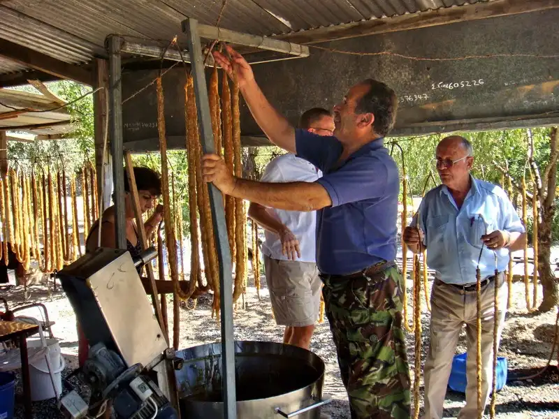 1. Между сбором винограда и изготовлением сока Михалис завез нас к своим друзьям. В саду под навесом происходило действо.