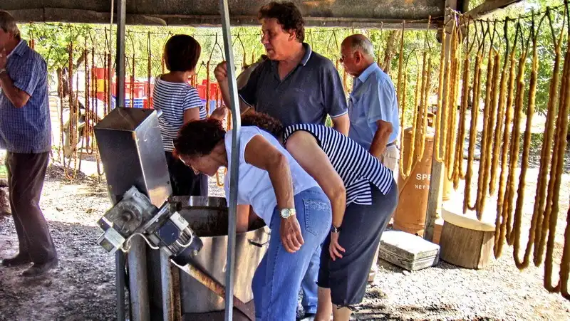14. В котле-«хартци» долго (несколько часов) упаривают виноградный сок, но не из темного винограда, как мы делали, а из зеленого, добавляя немного муки. Процесс этот немного механизирован – котел напоминает подогреваемый миксер, но на эту стадию мы опоздали и «мешалку» сняли, и от преждевременного загустения палюзе «спасали» вручную.