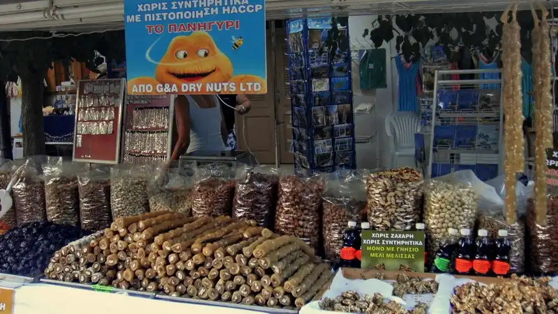 3. Мы, конечно, сразу сообразили, так вот какой ты, северный олень! что тут делают джукджук – вкусные сладковатые «колбаски» с орехами внутри. Да, я знаю, что у нас, на Кавказе, ЭТО называют чурчхеллой. Не будем больше об этом. Скажу более – малость тыкнувшись в инет я выяснила, что кипрская разновидность чурчхеллы называется вовсе не джукджук, а судзуко. Но хоть и с памятью у меня беда, но со слухом пока все в поряде, да и не только я, но и вся наша компания уверена, что местные произносят как «джукджук». На прилавках обычно выглядит вот так.