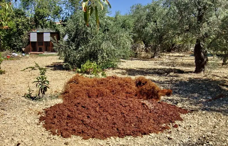 20. Основа палюзе – виноградный сок, при его производстве остается жмых. Когда мы сделали 45 литров (или бутылок – я так и не поняла) сока, то у нас было два полных больших ведра жмыха и вместительный мешок «веточек». А эта кучка отходов от производства палюзе, даже страшно представить сколько литров сока сделали.