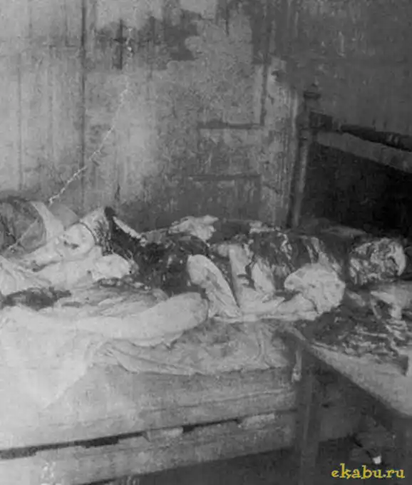 Горло Энни перерезано так глубоко, будто убийца хотел отделить голову от тела. Внутренности аккуратно вынуты и разложены рядом с телом. Работа проводилась длинным тонким ножом — вероятнее всего, специальным инструментом для вскрытия. Матку убийца забрал с собой.