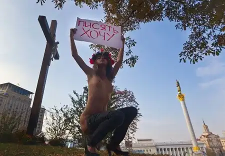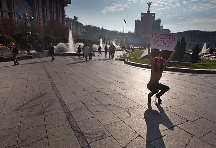 Наконец-то активистка движения сняла трусы...В этот раз девушка из FEMEN пыталась обратить внимание на нехватку общественных туалетов в столице Украины. Ну это по-моему совсем перебор. Мне кажется этим девочкам пора лечиться!