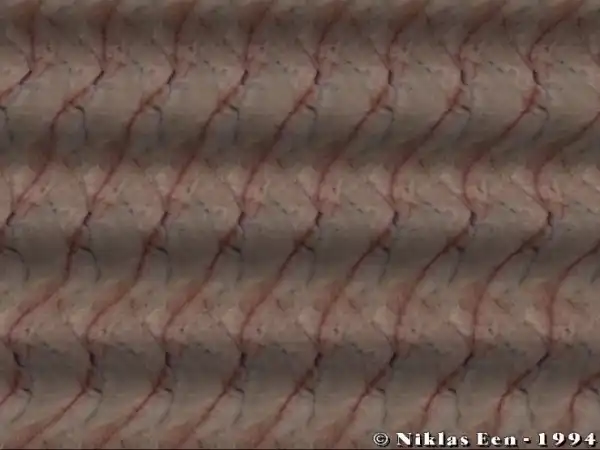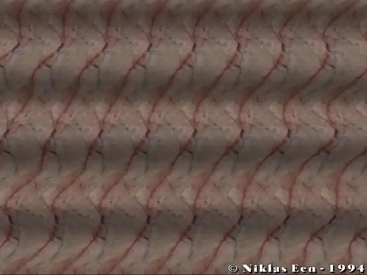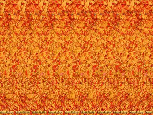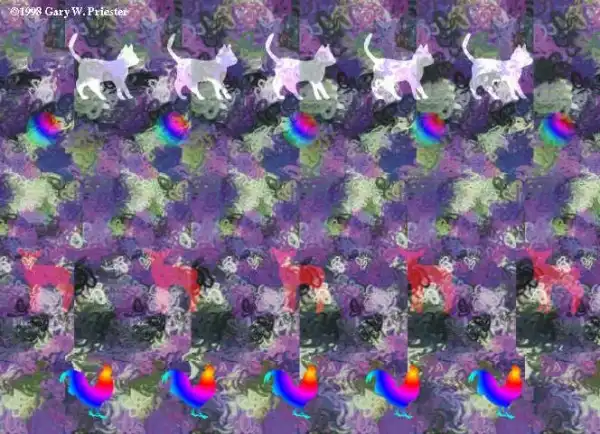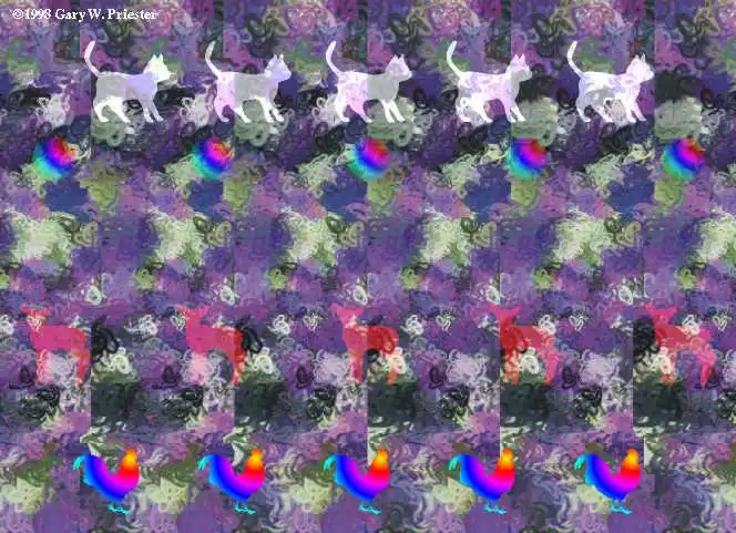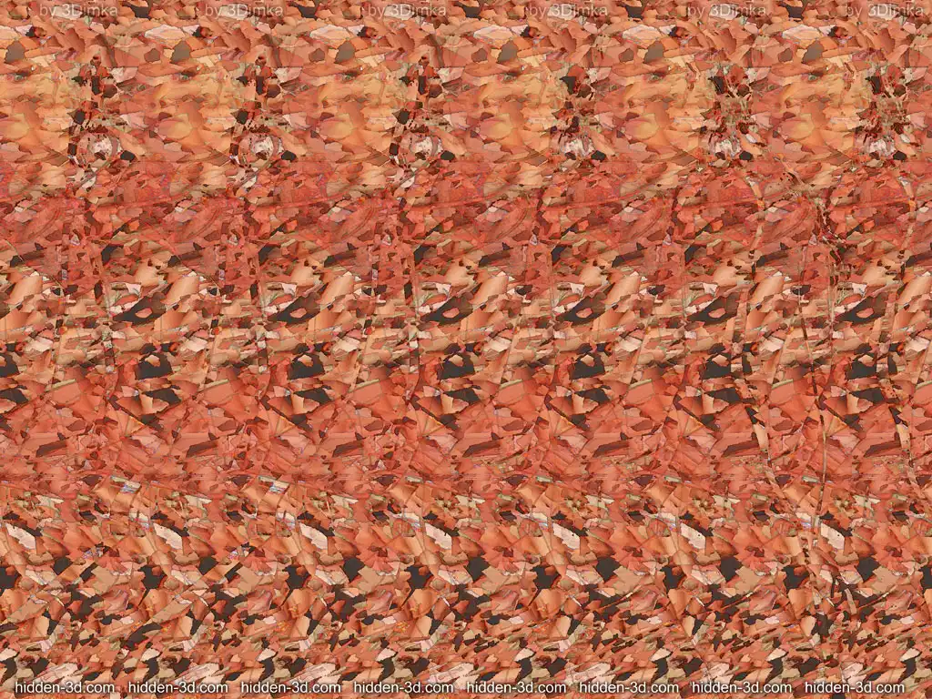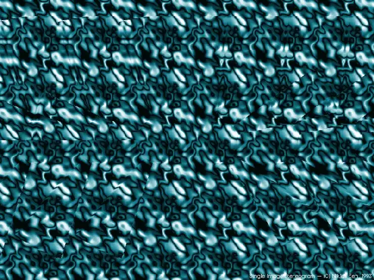 Возможно, определенные трудности возникают от незнания того, как в принципе выглядит скрытое объемное изображение. Люди с развитой фантазией запросто могут увидеть в причудливом сочетании узора на стереограмме все, что угодно. Я называю это эффектом конской головы. То, что вы должны увидеть, выглядит примерно так: картинка отдаляется от вас, и над ней висит объемный объект, как бы склееный из бумаги с таким же узором как на самой стереограмме.