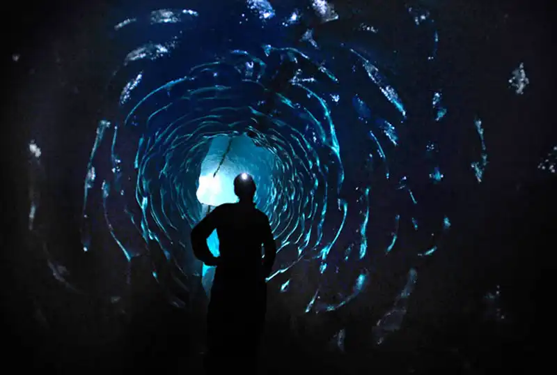 «Я живу в пещерах 4-5 дней. Некоторые из них совсем крошечные, и я могу исследовать их за час, а на исследование других уходит несколько дней, и мне хочется осмотреть каждый поворот и уголок». На фото: ледник Менденхолл на Аляске. Растаявший лед каскадами стекает с поверхности на дно.