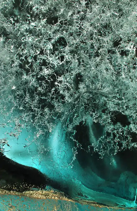 В леднике Менденхолла на Аляске. «Эта маленькая пещерка размером с кладовую – одна из моих самых любимых. Ее стены подсвечиваются солнечным светом, отражающимся недалеко от входа. Хотя сам лед выглядит рваным, на самом деле он гладкий и ровный, местами до трех метров толщиной. Темные участки самые толстые, а более светлые вокруг – места, где солнце смогло пробиться. Белые линии – трещины, образованные давлением».