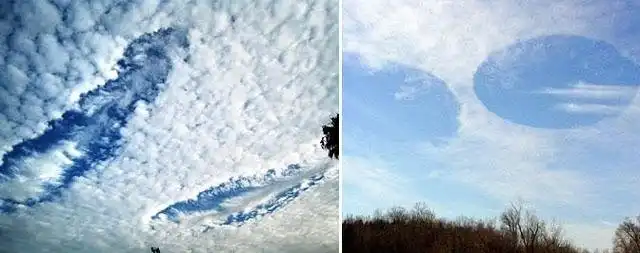 Округлые или овальные дыры иногда возникают в слое переохлажденных облаков. Часто они приобретают форму идеального круга, сохраняют ее в течение достаточно долгого промежутка времени и плывут вместе со слоем облаков. Одно объяснение этого феномена ссылается на воздушное движение (перекрещивание конденсационных следов реактивных самолетов), соединяющееся с термальной инверсией (циркулярное движение теплых слоев воздуха). Звучит малопонятно, но выглядит красиво