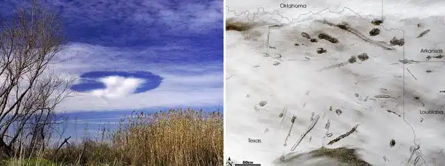 Спутник НАСА "Терра" сделал эти снимки в южной Луизиане: огромное количество круглых дыр, простирающихся, на самом деле, над несколькими штатами: Оклахомой, Арканзасом, Луизианой и Техасом. Некоторые из них были продолговатыми, некоторые, как оказалось, имели более маленькие облака внутри.