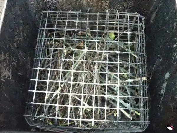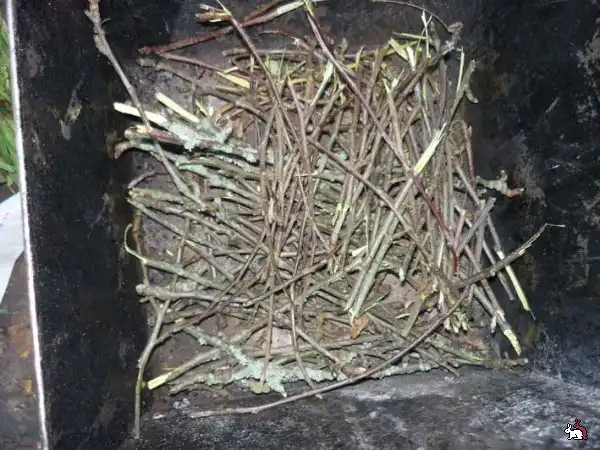 Наполняем коптильню материалом. Можно наверно купить готовую стружку, но поскольку я делаю все в деревне я использую ветки фруктово-ягодных деревьев: яблоня, вишня. Их мелко ломаю и укладываю на дно.