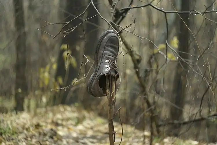 По периметру лагеря натыканы шесты с туфлями, так здесь освежают и проветривают обувь, меняют ее раз в неделю. У каждого жителя по три пары.