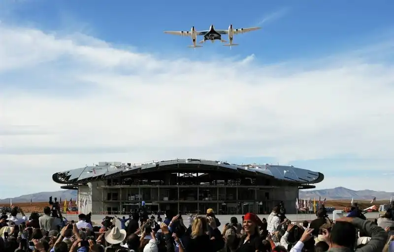 Ракетоплан «SpaceShipTwo» компании «Virgin Galactic» заходит на посадку под самолетом-носителем «White Knight Two» во время церемонии его посвящения недалеко от Лас Крусес, штат Нью-Мексико, 22 октября. Планируется, что ракетоплан «SpaceShipTwo» отвезет первых пассажиров на край открытого космоса уже через пару лет.