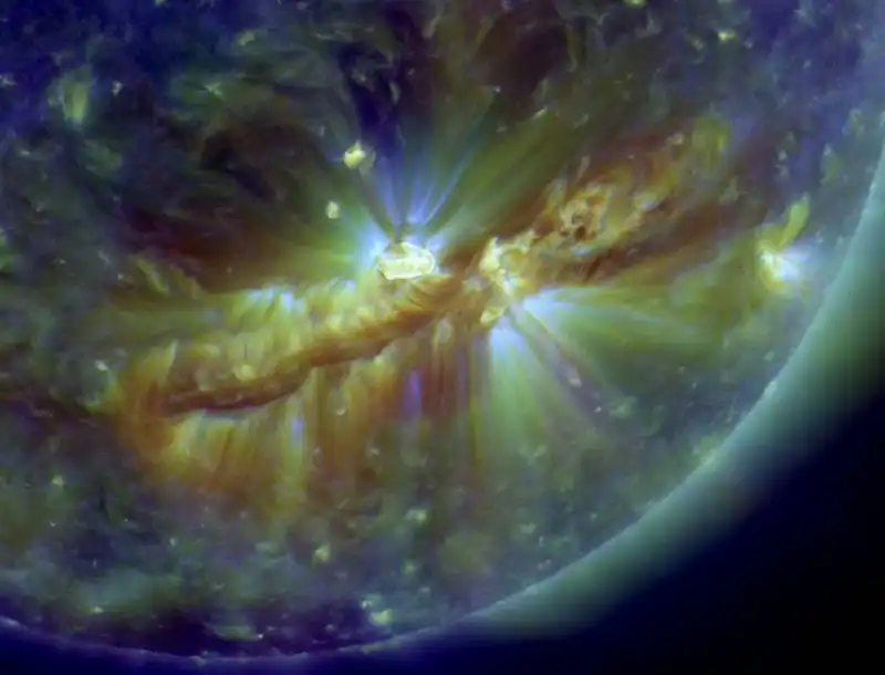 На этом снимке Обсерватории солнечной динамики НАСА, сделанном 21 октября, показано солнечное пятно со вспышками на солнце. Кроме того, широкая полоса магнетизма прорезает южное полушарие солнца. Полоса огромна – шире, чем расстояние от Земли до Луны.