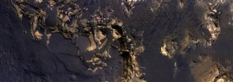 Этот снимок Марсианского разведывательного спутника, опубликованный 20 октября, демонстрирует блоки яркого слоистого марсианского камня, лежащего в более темном веществе, которое, скорее всего, осталось после крупного наводнения, когда Узбой Валлес сломал край кратера Холдена. О магнитуде этого наводнения можно судить по крупному размеру камней – до 91 метра в диаметре. Кратер Холдена – одно из потенциальных мест приземления вездехода НАСА «Curiosity» в ноябре 2011 года. Геология этой территории говорит о более влажном и теплом периоде в ранней истории Марса, поэтому кратер – один из главных объектов исследования.