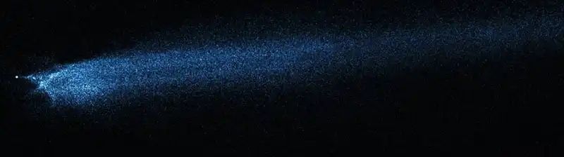 На этом снимке, сделанном телескопом «Хаббл» и опубликованном 13 октября, можно увидеть странный Х во главе следа материалов в виде кометы. Ученые утверждают, что этот «Х», вероятно, является местом столкновения астероидов. 120-метровый объект на этом фото считается остатками более крупного тела, столкнувшегося с камнем 3-4 метра в диаметре на скорости 17702 км/час. В результате столкновения случился взрыв силы небольшой атомной бомбы. Астроном Калифорнийского университета Дэвид Джуитт считает, что столкновение произошло в феврале или марте 2009 года.