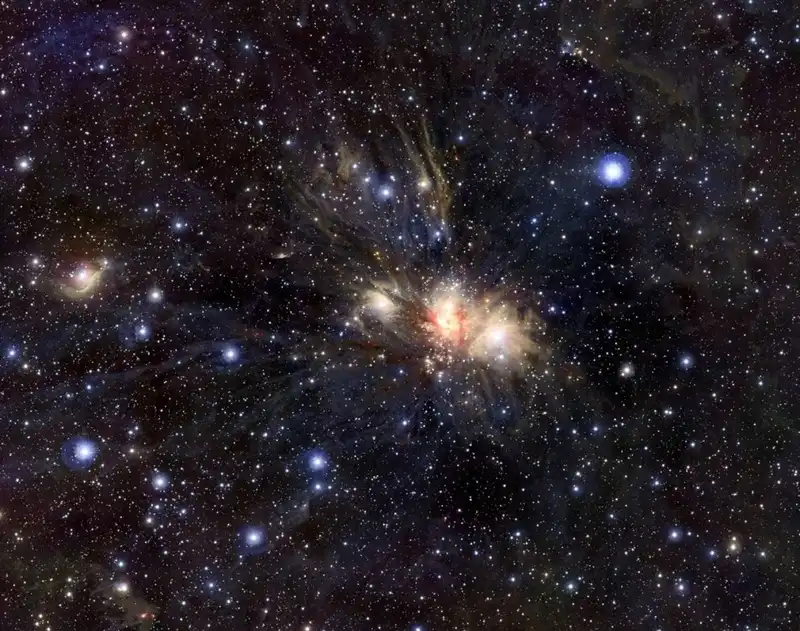 Этот инфракрасный снимок, опубликованный 6 октября, демонстрирует регион формирования звезд на расстоянии 2700 световых лет от Земли. Monoceros R2 – ассоциация крупных молодых звезд, подсвечивающих прекрасную коллекцию отражения туманности в крупном молекулярном облаке. Снимок был сделан телескопом «VISTA» в обсерватории Чили