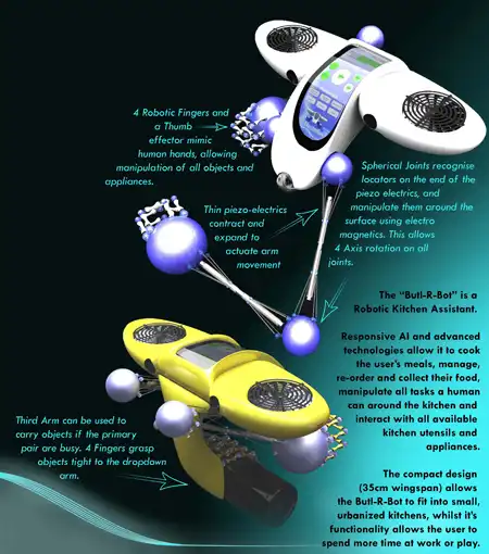 Бот Butl-R – это футуристический робот-кухонный помощник. Он спроектирован на базе быстро реагирующего искусственного интеллекта и инновационных передовых технологий. Робот снабжен практически человеческими руками, камерами и усовершенствованными сенсорами, системой подвижных вентиляционных элементов, и многими другими функциями. Применяя на деле все эти полезные утилиты, робот может готовить блюда, принимать заказы и собирать использованную посуду. Он даже может взаимодействовать с кухонными приборами благодаря компактной форме (размах «рук» всего 35 см) и способен работать практически в любых условиях. Этот функциональный кухонный помощник позволит деловым и постоянно напряженным пользователям будущего уделять больше времени развлечениям или работе.