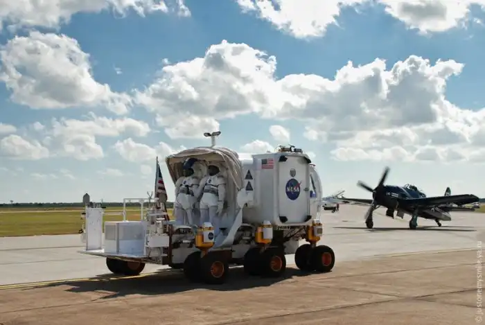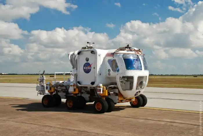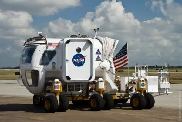 Первым появился луноход. Space Exploration Vehicle, или SEV. Луноход оборудован шестью независимыми колесными парами, способными поворачиваться на 360 градусов, что позволяет ему передвигаться боком, благодяря чему луноход может обьезжать любые препятствия без дополнительных маневров. Он способен забираться на уклоны до 40 градусов. База лунохода была разработана командой инженеров, занимающихся дизайном и подготовкой машин для ралли. Скорость лунохода – 10 км в час, в любом положении колес. Луноход имеет герметичную кабину, и способен поддерживать космонавтов как независимый корабль на протяжении 14 дней. Внутри есть мини кухня и спальные места для двух человек.