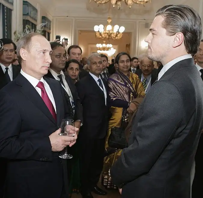 6. Владимир Путин: "Господин Ди Каприо, я считаю, не приехал, а прорвался к нам, как через линию фронта, сюда. Про таких у нас в народе говорят: настоящий мужик. И я думаю, если дело защиты природы будет находиться в руках людей с таким характером, то мы обречены на успех".